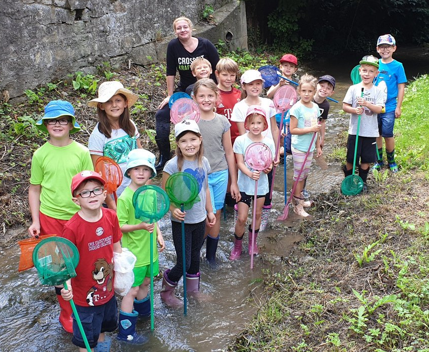 Die Ferienpasskinder aus Dettelbach haben sich am 8. August 2019 getroffen, um die Geheimnisse in und an der Dettel mit Gummistiefeln und Käschern zu erkunden.